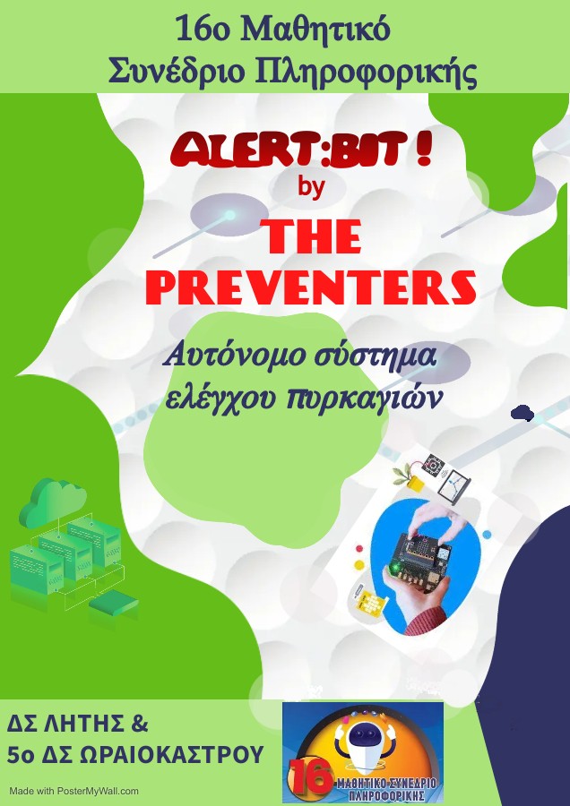 Η ομάδα ρομποτικής The Preventers από τα δημοτικά σχολεία Λητής και 5ου Ωραιοκάστρου (Μελισσοχώρι), σκέφτηκαν και ανέπτυξαν ένα αυτόνομο σύστημα ελέγχου και αποτροπής της πυρκαγιάς. Το έργο τους ονομάζεται Alert:bit (από τη σύνθεση των λέξεων Alert=ειδοποιώ + bit από τον μικροελεγκτή Microbit που χρησιμοποιούν). Η ομάδα ονομάζεται The Preventers και το έργο τους στοχεύει στην μετάδοση σε πραγματικό χρόνο των περιβαλλοντικών συνθηκών που επικρατούν στο δάσος και την αυτόματη αποστολή οχήματος ρομπότ για έλεγχο σε περίπτωση που τα δεδομένα δείξουν κίνδυνο πυρκαγιάς. Τα παραπάνω επιτυγχάνονται με τη χρήση του μικροελεγκτή Microbit, μιας IoT συσκευής, αισθητήρων και του DF Maqueen ρομπότ. Ο μικροελεγκτής microbit διαβάζει τα δεδομένα που στέλνουν οι αισθητήρες υγρασίας ατμόσφαιρας, υγρασίας εδάφους, θερμοκρασίας και καπνού και με τη χρήση της IoT συσκευής τα δεδομένα αυτά είναι διαθέσιμα σε πραγματικό χρόνο στο Κέντρο Ελέγχου. Αν υπάρξουν επικίνδυνες τιμές για πυρκαγιά, όπως για παράδειγμα μηδενική υγρασία, πολύ υψηλή θερμοκρασία τότε μέσω ραδιοσυχνοτήτων ξεκινάει το όχημα ρομπότ να ελέγξει το δάσος με line tracking.